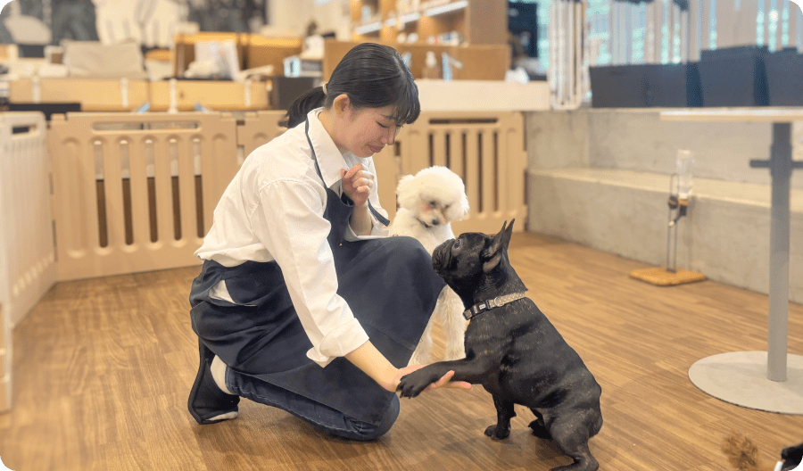 子犬を迎えてすぐはしつけに不安を抱える飼い主様も多いと思います。ようちえんに通ってくださっているワンちゃんが問題行動を改善し、飼い主様が安心する様子や、褒められて嬉しそうなワンちゃんの姿を見ると私も幸せな気持ちになります。幸せ配達人としてただワンちゃんをお届けするだけでなく、お家に行ったその後もサポートできることに本当の意味での幸せ配達人としてのやりがいを感じています。