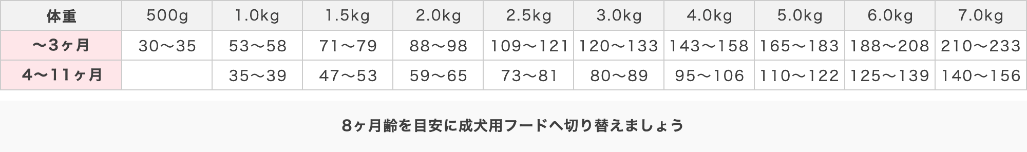 - 生後6ヶ月を過ぎたころから食べる量が少なくなったと感じられます。フードにあきて食べなくなったのではなく、成長に伴い食べる量が落ち着いてきたので、フードパッケージなどに記載がある給餌量をご確認ください。