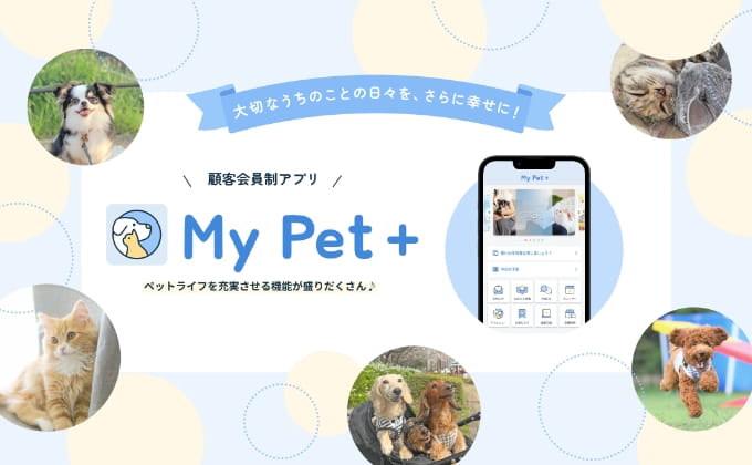 「ペットの一生に寄り添いペットの幸せをかなえる」とのコンセプトをもとに開発したアプリ、My Pet+(マイペットプラス)は、Pet Plusで迎えたワンちゃん・ネコちゃんと飼い主様のQOLを向上させる当社オリジナルアプリです。