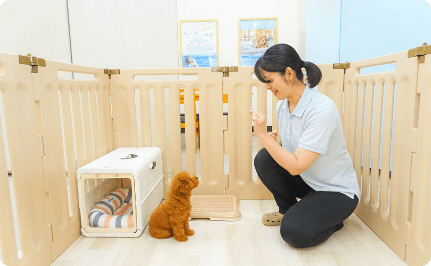 ワンちゃんにはその他にも、お手入れ慣れやお散歩練習、トイレや甘嚙みに対するトレーニングなど、心身の負担にならないようにしっかりと見極めながら実施しています。